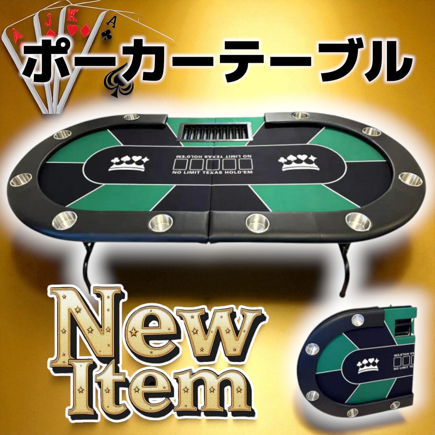 | 商品の特徴 | 2656新品*ポーカーテーブル10人対応カジノ チップラック ドリンク。2654新品*ポーカーテーブル10人対応カジノ チップラック ドリンク。2654新品*ポーカーテーブル10人対応カジノ チップラック ドリンク。◆ご閲覧ありがとうございます!万が一初期不良の場合は対応させていただきます。◆北海道、沖縄、離島への配送は別途郵送料がかかります。対象の方はコメント欄にコメントをお願いします。◆商品説明カラー グリーン■工具不要で簡単組立・折りたたみ収納可能組立は設置箇所でテーブルを広げて脚を伸ばしてフレームを固定するだけ。折りたたみ式の脚を採用し、使用後はコンパクトに収納可能。■耐久性・安定性に優れた構造本体重量約38kg。耐荷重100kg設計で安定性抜群。頑丈なフレームと天板で、長時間の使用にも耐える高い耐久性を実現。脚部フレームには固定用ワイヤーが付属しており、より安定性が高まる設計。地面設置面には滑りにくいラバーフットを採用し、床を傷つけずに安定した設置が可能。■4カラーバリエーションフレームカラーの選択肢があり、インテリアや好みに合わせて選択可能。赤・青・緑・黒の4色を基調としたデザイン展開。■多用途な利用シーンポーカーだけでなく、ブラックジャックやその他のカードゲーム、ボードゲーム、カジノゲームにも最適。ポーカーバー、アミューズメントバー、自宅、オフィス、パーティー用など多様なシーンで活躍。展開時サイズ縦106cm × 横212cm × 高さ78cm折りたたみサイズ縦106cm × 横106cm × 奥行18cm本体重量:38kg耐荷重:100kg■最低推奨利用スペースサイズ・縦 312cm〜(いす用スペース:50cm*2)・横 206cm〜(いす用スペース:50cm*2)※成人男性が座った状態で椅子を手前に引いて通行できる程度の参考サイズデータとなります。■50個*10列(最大500個)のチップラックを装備チップを収納できるチップトレイが付属。ゲーム中のチップ整理がスムーズで大容量チップ収納によりゲーム性を拡大します。■最大10人で楽しめるポーカーテーブル便利なドリンクホルダーも10個付き。各プレイヤーに専用のカップホルダーを配置。飲み物を安全に置けるため、ゲームを快適に楽しめます。■高品質・高級感のあるフェルト素材高品質のフェルトやアームパッドにはPUレザーを使用し、見た目も手触りも高級感抜群。防汚・撥水加工により、簡単に清掃可能。。ポーカーテーブル 折りたたみ 10人対応 家庭用 業務用 最大500枚チップ。S.GAP。【初代】ポケットモンスター トランプ ピカチュウバージョン。トランプ 貴重 デック D&D。トランプ Cherry Casino playing cards v1。BLEACH 名言トランプ。新品 ポーカーカジノ角チップ 10000(壹万) 紫 ×100枚セット プラーク。PRADA プラダ タロットカード 22枚。LOUIS VUITTON ルイヴィトン×村上隆 コラボ トランプ 非売品 レア。トランプ richard petty playing card。【新品未使用品】 村上隆 UNO。ビンゴゲーム。【激レア】WPTデック♠赤青セット。カジノチップ$1000表記 100枚 ポーカー バカラ チップ カジノ ヨコサワ。トランプ NINTENDO 原田治 FUJICOLOR JAL キティ 他。キャバ 歌舞伎町フォーティーファイブ トランプ。未使用 トランプ 11個 まとめ売り 貴重 レア。Supreme トランプ。ポムポムプリン。Zach3人直筆サインレアトランプRipndip Fontaine。27 カジノチップ 183枚 100$ ポーカーチップ H26年。名探偵コナン トランプ サンデー 応募者全員サービス | ||
