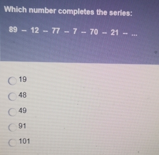 7/07×19 8/07×2 9/77×8 10/77×2 3/0×5 Solved: Which number completes the series: 89-12-77-7-70-21- _